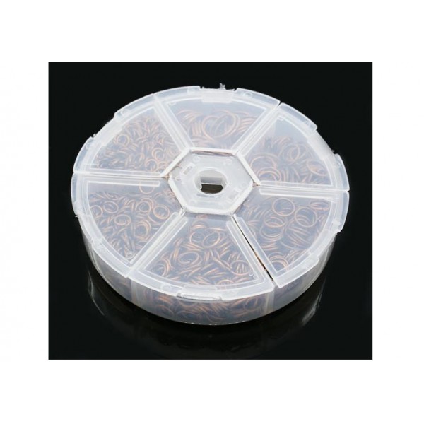 1745 runde und filigrane, kupferfarbene Biegeringe in einer praktischen Sortierbox. Mit den Biegeringen lassen sich viele Arten von Schmuckverschlüssen an Gliederketten u.ä. anbringen, aber man benötigt auch Biegeringe um z.B. Anhänger zu befestigen.