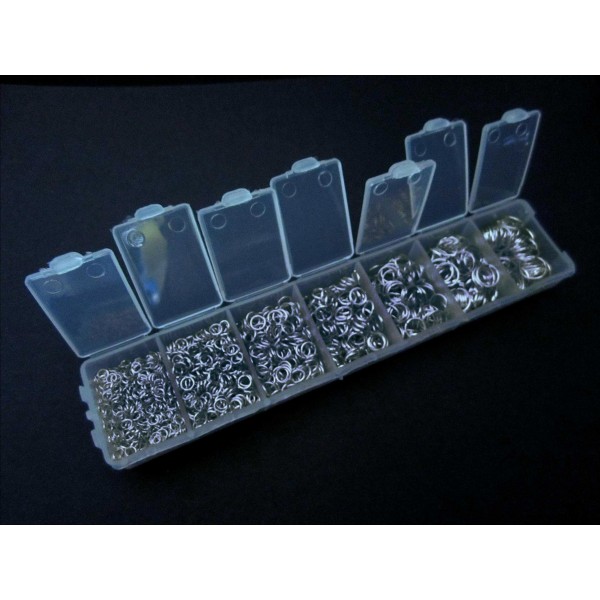 1500 runde und filigrane, silberfarbene Biegeringe in einer praktischen Sortierbox. Mit den Biegeringen lassen sich viele Arten von Schmuckverschlüssen an Gliederketten u.ä. anbringen, aber man benötigt auch Biegeringe und Spaltringe um z.B. Anhänger zu befestigen.