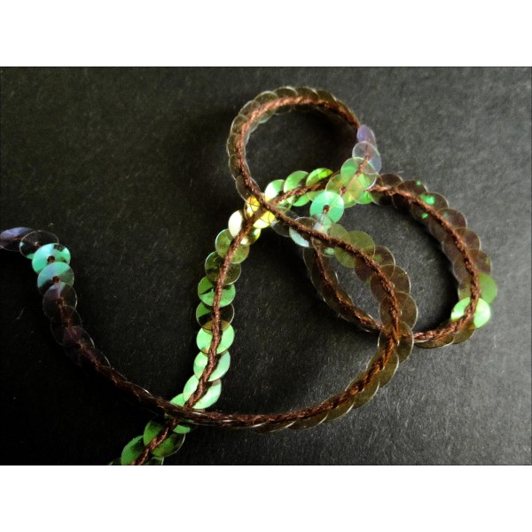 1 Meter grün-schwarz-lila irisierendes Paillettenband. Die kleinen grün-lila-schwarz schimmernden, irisierenden Pailletten haben einen Durchmesser von 6mm. Das Fädelloch ist in der Mitte, siehe Foto.