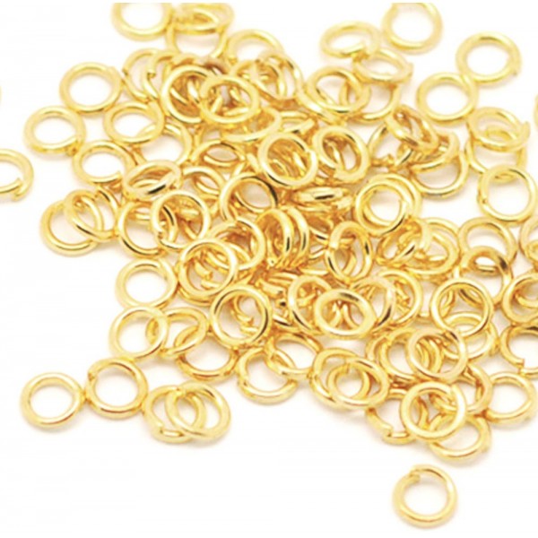 50 runde und filigrane, goldfarbene Biegeringe Größe 5mm. Mit den goldfarbenen Biegeringen lassen sich viele Arten von Schmuckverschlüssen an Gliederketten u.ä. anbringen, aber man benötigt auch Biegeringe und Spaltringe um z.B. Anhänger zu befestigen.