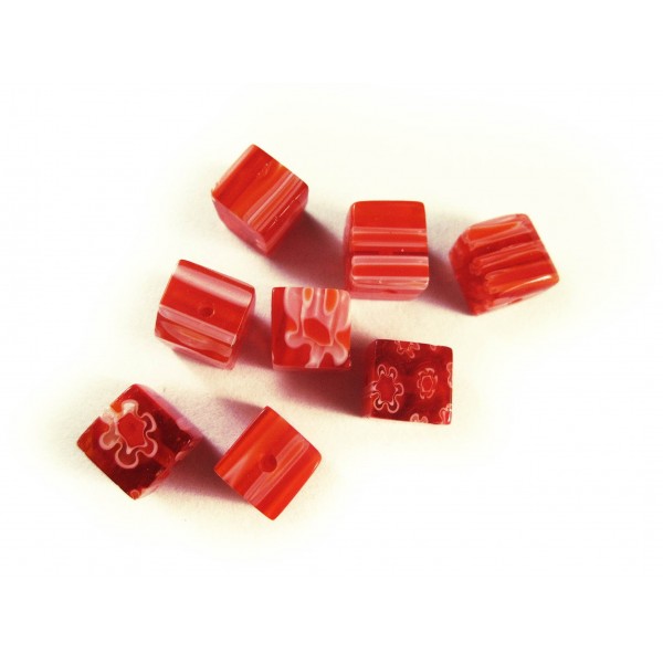 8 Stück rote, bzw. rottönige Millefiori Glasperlen mit farbigen kleinen Blumen. Die würfelförmigen, durchsichtigen Millefioriglas Perlen haben eine Kantenlänge von 8mm.