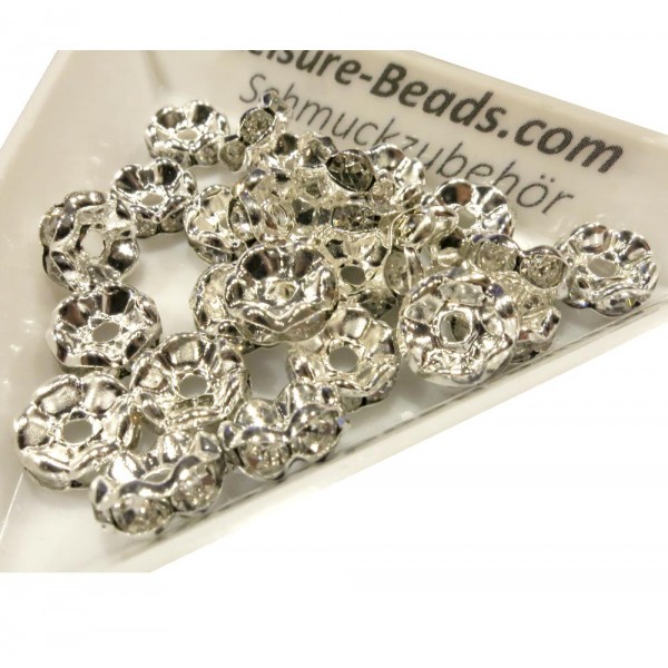 25x hellsilberfarben Strassrondelle in der Größe 8x3,6mm als flache, filigrane Metallperlen, besetzt mit kleinen, funkelnden, transparenten Strasssteinchen.