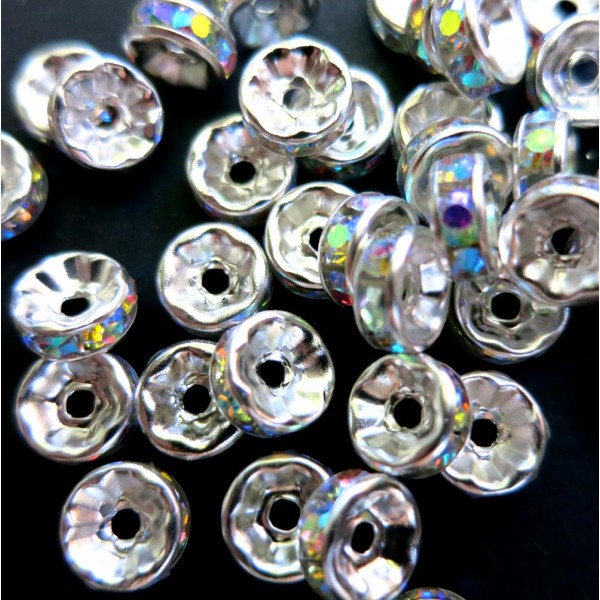 5x hellsilberfarben Strassrondelle in der Größe 8x3,6mm als flache, filigrane Metallperlen, besetzt mit kleinen, funkelnden, transparenten Strasssteinchen aus Acryl mit AB-Effekt.