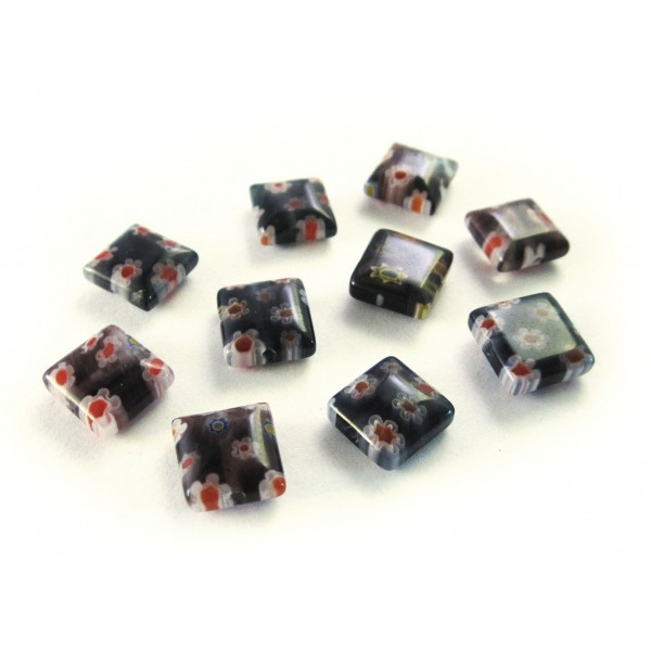 10 Stück schwarze Millefiori Glasperlen mit farbigen kleinen Blumen. Die flachen, durchsichtigen Millefioriglas Perlen haben eine Kantenlänge von 8mm und eine Dicke von 3mm und ähneln der Form eines flachen Kissens.