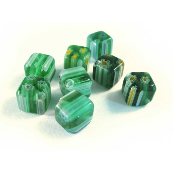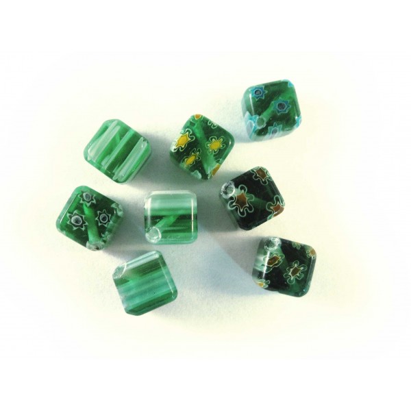 8 Stück grüne, bzw. grüntönige Millefiori Glasperlen mit farbigen kleinen Blumen. Die würfelförmigen, diagonal angeordneten, durchsichtigen Millefioriglas Perlen haben eine Kantenlänge von 7mm und eine Fädelbreite von 12mm.