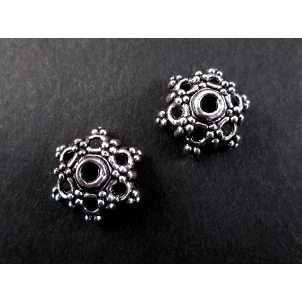 2 große, silberfarbene Perlenkappen in filigraner und runder Sternform.