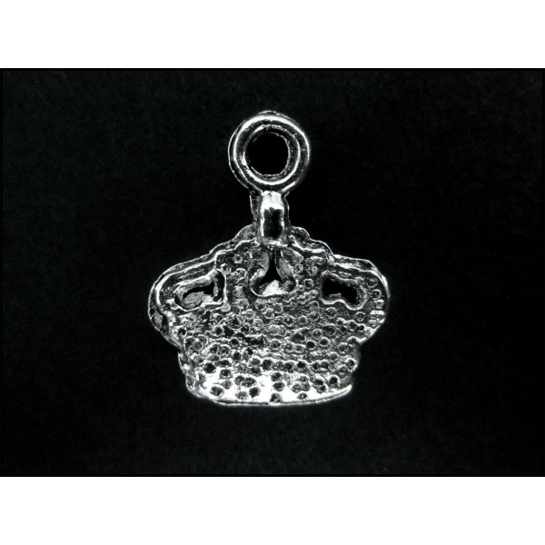 2 silberfarbene Anhänger in Form einer Königskrone als Schmuckanhänger für die eigene kreative Schmuckherstellung. Die Kronen sind auf der Vorderseite profiliert und auf der Rückseite uneben ausgeführt. Die silberfarbenen Kronen bestehen aus Metall und eignen sich hervorragend für Ohrringe u.ä.