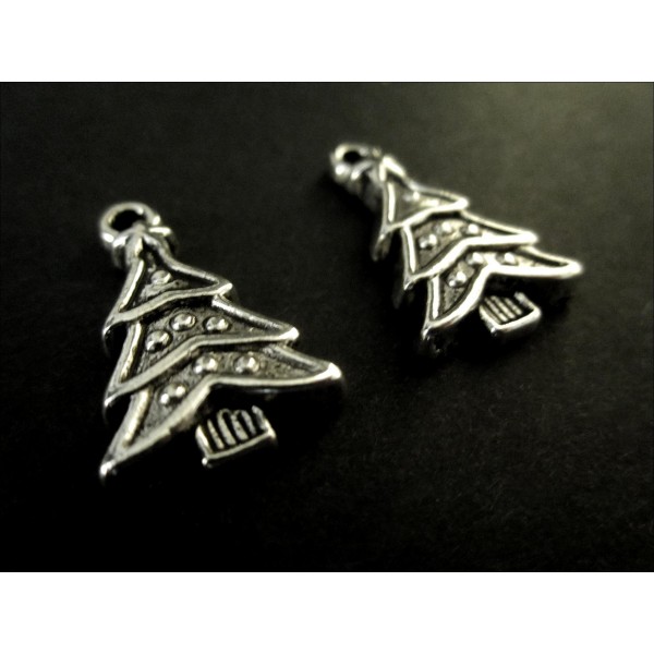 2 silberfarbene Anhänger in Form von einem filigranen Weihnachtsbaum mit Weihnachtsschmuck als Schmuckanhänger oder Weihnachtsanhänger für die eigene kreative Schmuckherstellung. Der silberfarbene Weihnachtsbaum bzw. Tannenbaum, ist auf der Rückseite hohl ausgeführt, s. Foto.