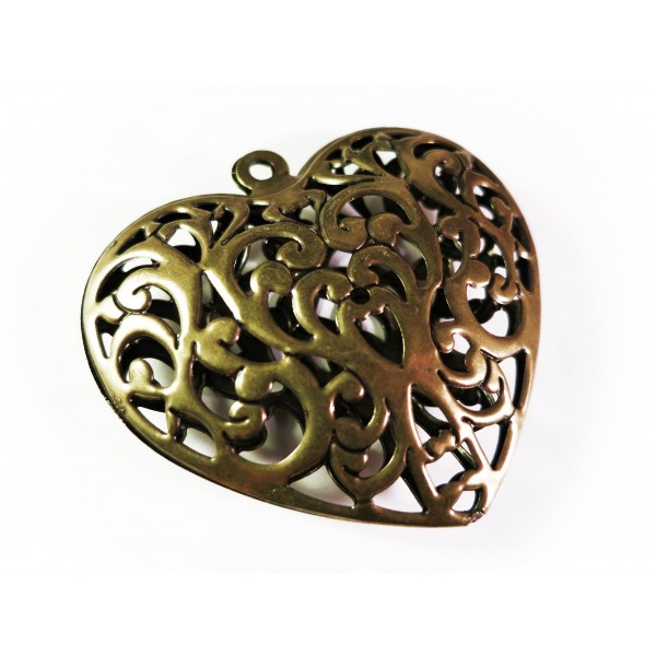 1 großer altgoldfarben / bronzefarbener Anhänger in filigraner, floraler Herzform als Schmuckanhänger für die eigene kreative Schmuckherstellung. Der filigrane, bauchige Herzanhänger ist auf der Vorder- und Rückseite gleich ausgeführt. Der Herzanhänger besteht aus einem filigranen, trachtenähnlichem Blumenmotiv und eignen sich hervorragend für Schlüsselanhänger u.ä.