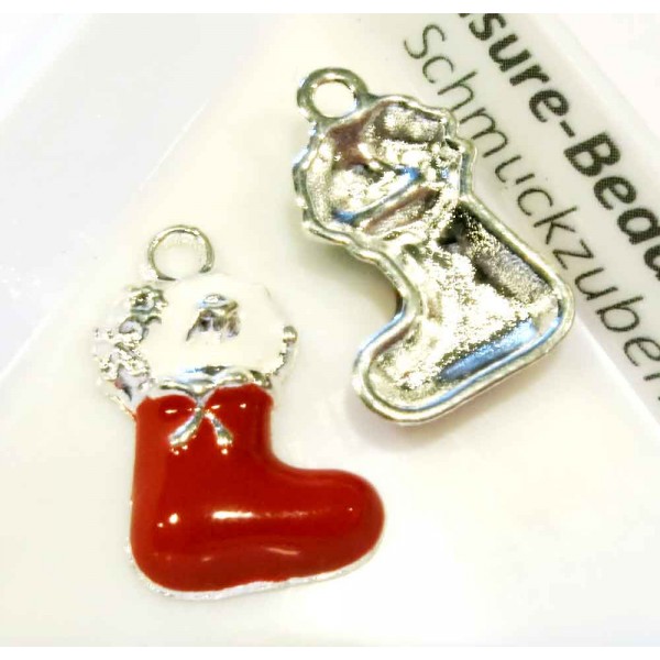 5 Weihnachts Anhänger als Schmuckanhänger in Form von gefüllten Nikolausstiefeln als weihnachtlicher Schmuckanhänger oder Weihnachtsanhänger für die eigene kreative Schmuckherstellung. Die Nikolausstiefel sind auf der Vorderseite emailliert und auf der Rückseite ohne Motiv ausgeführt, s. Foto.